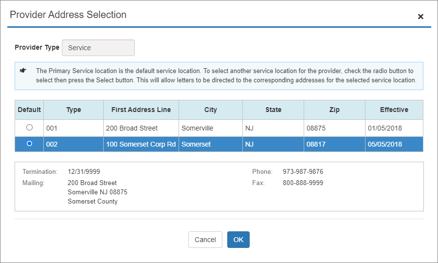 Example: Provider Address Selection Dialog